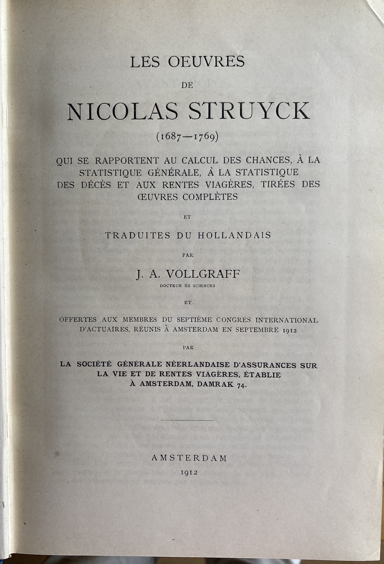Offertes Aux Membres Du Septieme Congres International D'actuaires Reunis A Amsterdam En Septembre 1912