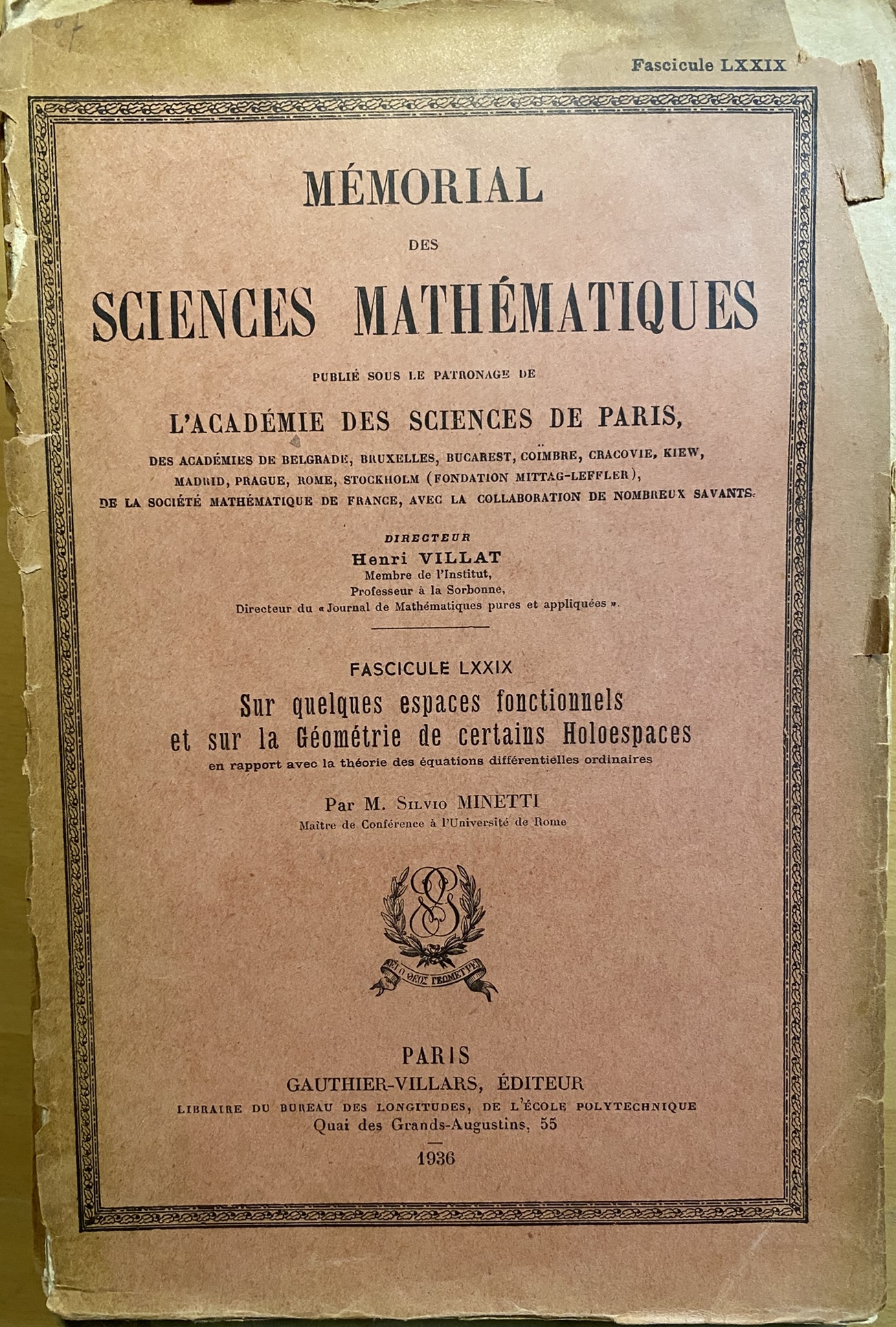 vijf delen Memorial Des Sciences Mathematiques Publie Sous Le Patronage De L'academie Des Sciences De Paris Des Academies De Belgrade Bruxelles Bucarest Coimbre Cracovie Kiew Madrid Prague Rome Stockholm (Fondation Mittag-Leffler) De La Societe Mathematique De France Avec La Collaboration De Nombreux