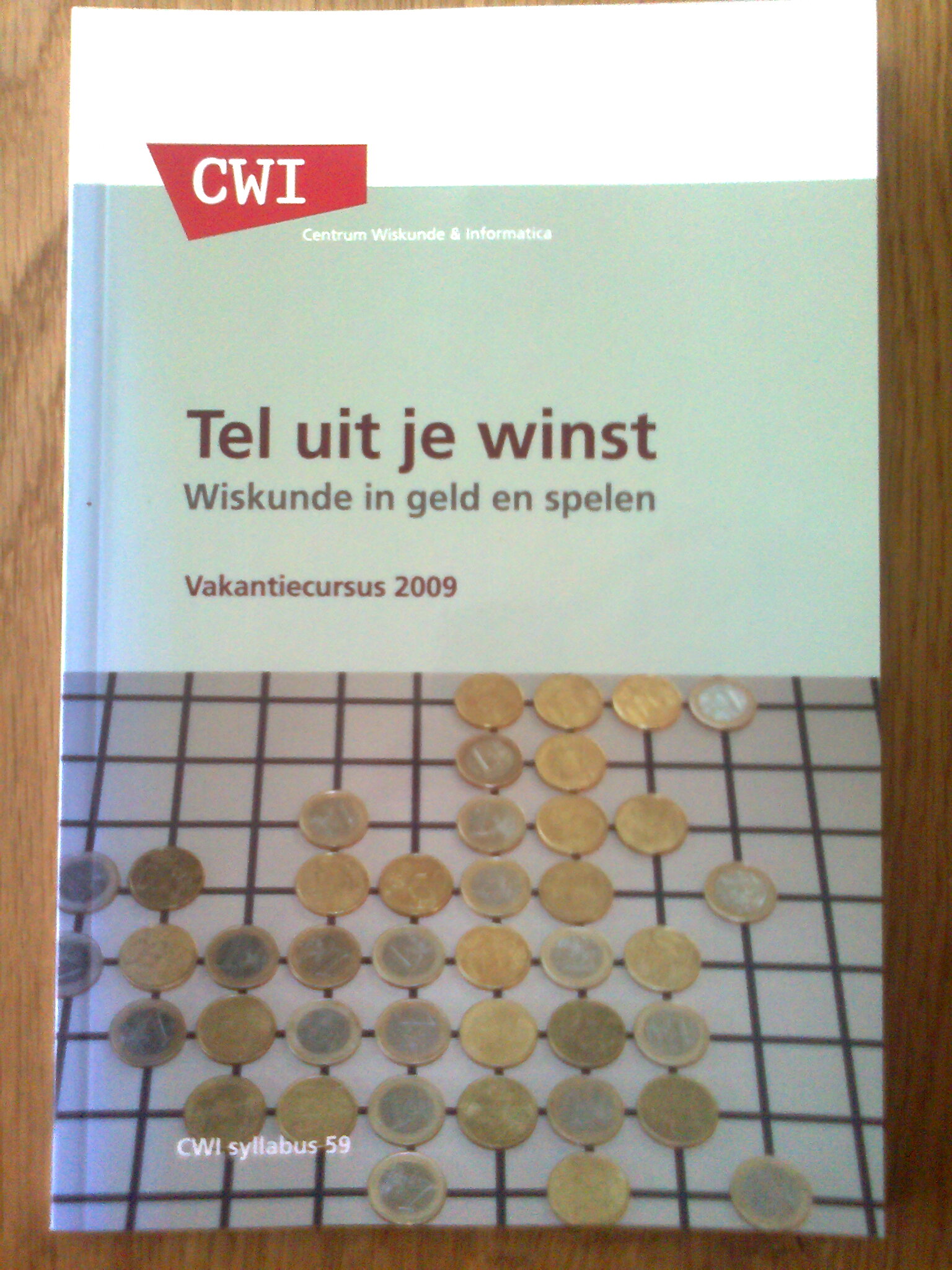 J. Aarts - Tel uit je winst - wiskunde in geld en spelen J. van Eijck - Social software in vier voorbeelden B. Windels - Paradoxen in de wiskunde C.W. Oosterlee - Een introductie in financiele producten en markten J.A.M. van der Weide - Financiele wiskunde P. Stevenhagen - Spelen met groepentheorie V. van der Noort - Is democratie wiskundig onmogelijk? G. Sierksma - Wiskunde en Sport J.P. Hogendijk - Lijfrentes in de zeventiende en achttiende eeuw